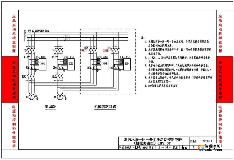 國家建筑標(biāo)準(zhǔn)設(shè)計24D303-4《消防水泵機(jī)械應(yīng)急啟泵控制》是基于國家標(biāo)準(zhǔn)《消防給水及消火栓系統(tǒng)技術(shù)規(guī)范》GB 50974-2014第11.0.12條:消防水泵控制柜應(yīng)設(shè)置機(jī)械應(yīng)急啟泵功能,并應(yīng)保證在控制柜內(nèi)的控制線路發(fā)生故障時由有管理權(quán)限的人員在緊急時啟動消防水泵。機(jī)械應(yīng)急啟泵時,應(yīng)確保消防水泵在報警后5.0min內(nèi)正常工作。本條款對消防水泵機(jī)械應(yīng)急啟泵的控制有強(qiáng)制性要求。另外工程建設(shè)全文強(qiáng)制性工程建設(shè)規(guī)范《消防設(shè)施通用規(guī)范》GB 55036-2022第3.0.12條第3款:消防水泵控制柜應(yīng)具有機(jī)械應(yīng)急啟泵功能,且機(jī)械應(yīng)急啟泵時,消防水泵應(yīng)能在接受火警后5min內(nèi)進(jìn)入正常運行狀態(tài)。本條款對消防水泵機(jī)械應(yīng)急啟泵列入到技術(shù)法規(guī)中。