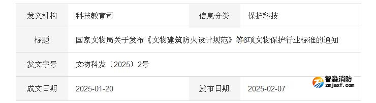 國家文物局關(guān)于發(fā)布《文物建筑防火設(shè)計規(guī)范》等6項文物保護行業(yè)標準的通知