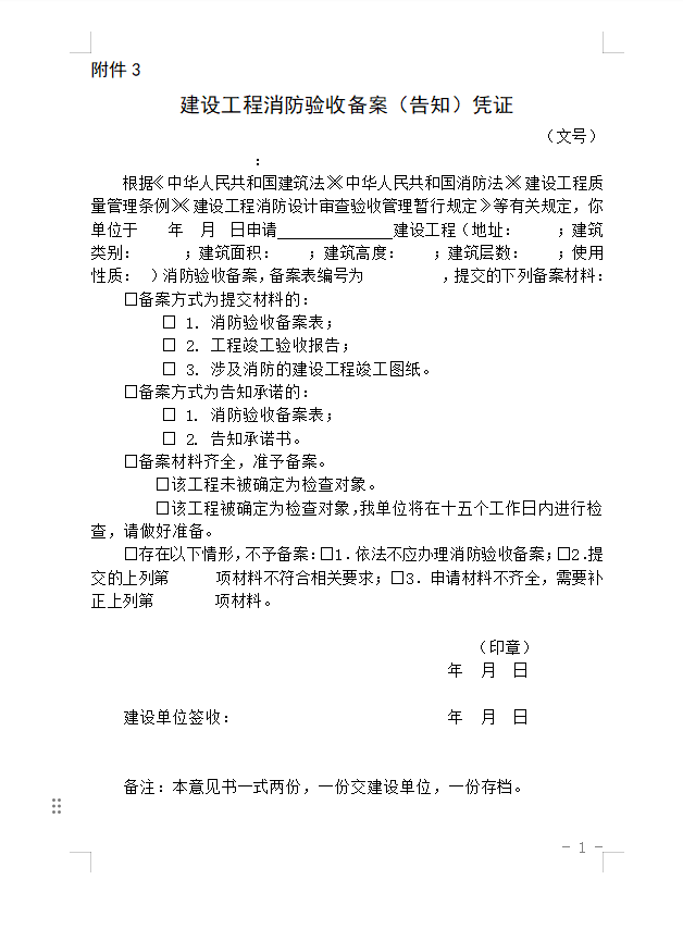 ?。ǘ┺k理環(huán)節(jié)。建設工程消防設計審查驗收主管部門對建設單位提交的申請材料進行形式審查。申請材料齊全且符合法定形式,出具備案憑證。申請材料不齊全或者不符合法定形式的,一次性告知建設單位需要補正的全部內容。